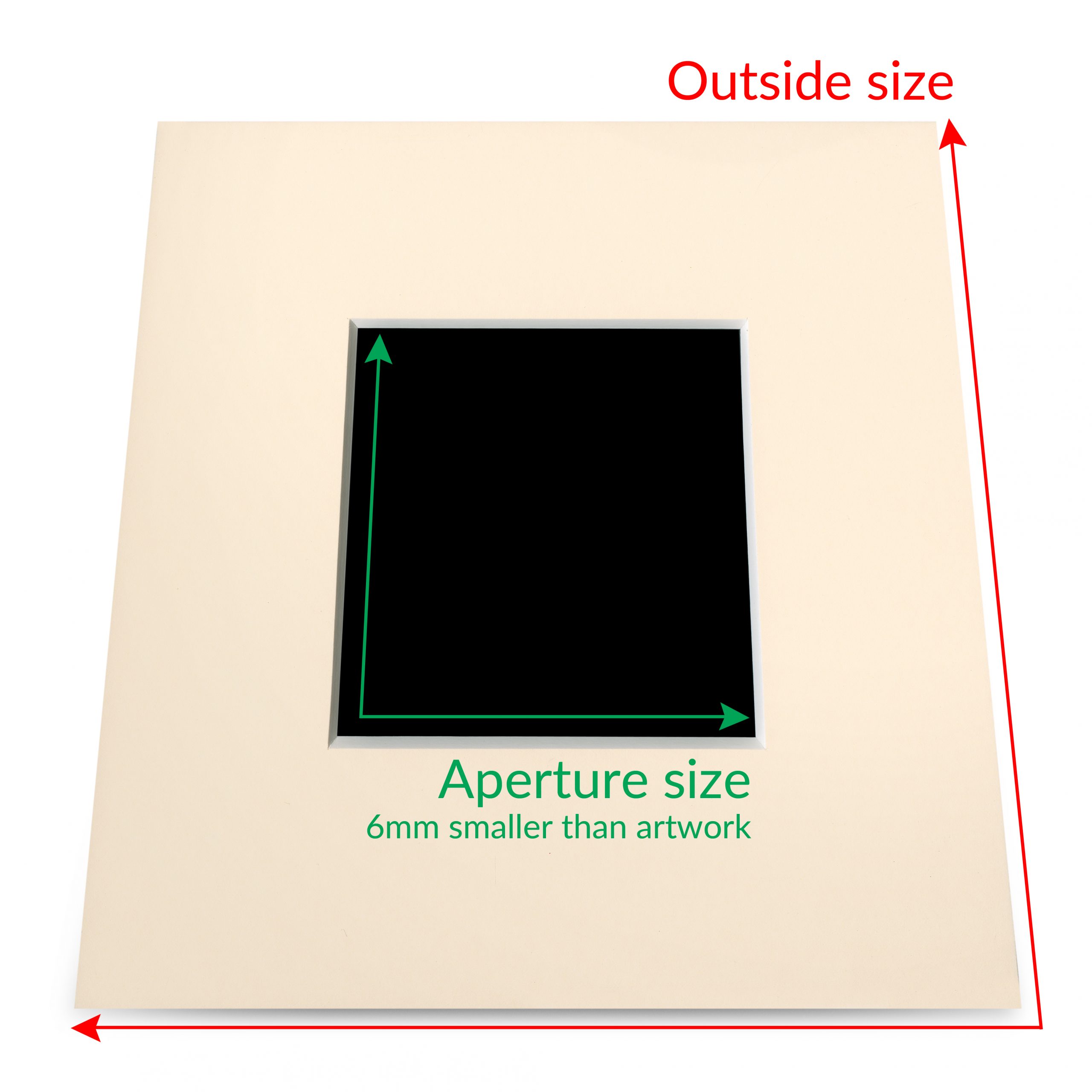 2 – Aperture size – There must be an overlap of approx 3mm on each size with the image and the aperture, with the image being slightly larger than the aperture so it stays in it’s correct position behind the mount. For example, a 20cm x 20cm paper size would require a aperture of 19.4cm x 19.4cm. Please calculate the exact aperture size you will need.