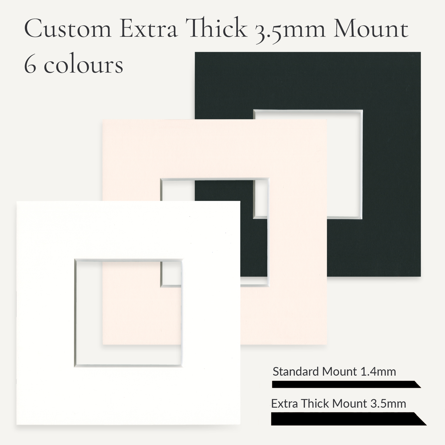 Our extra thick mounts are cut from 3.5mm thick (3500 micron) whitecore acid free mount card, as opposed to standard mounts, which are only 1.4mm or in some cases thinner.