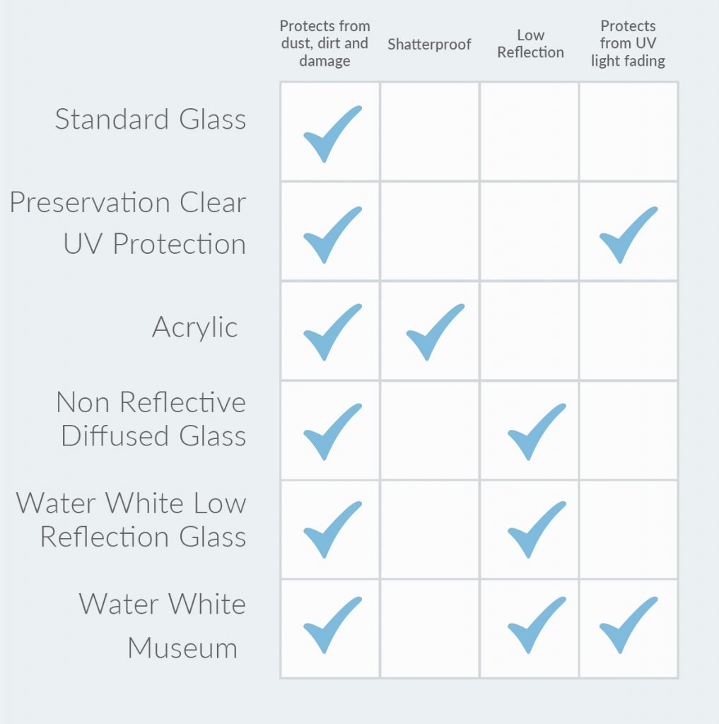 We offer a selection of glass depending on your needs, including non-reflective and specialist UV protection glass. Our standard 2mm picture glass is suitable for most applications, however specialist glass is an options can greatly enhance to look and conservation of your picture.
